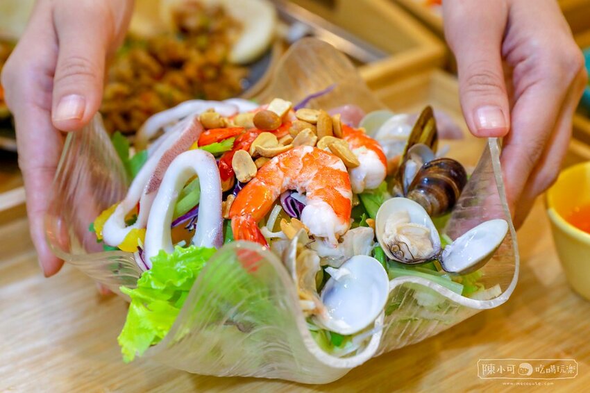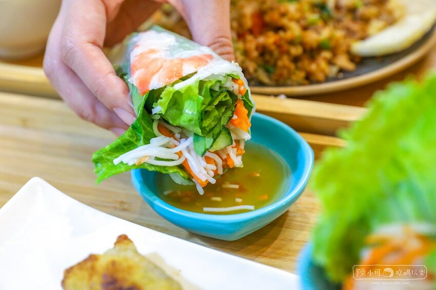 塞滿內餡的生春捲,米紙清爽軟Q,裡面包了蝦子、米線、蘿蔔、生菜和小黃瓜,食材清脆爽口,搭配沾醬味道升級。