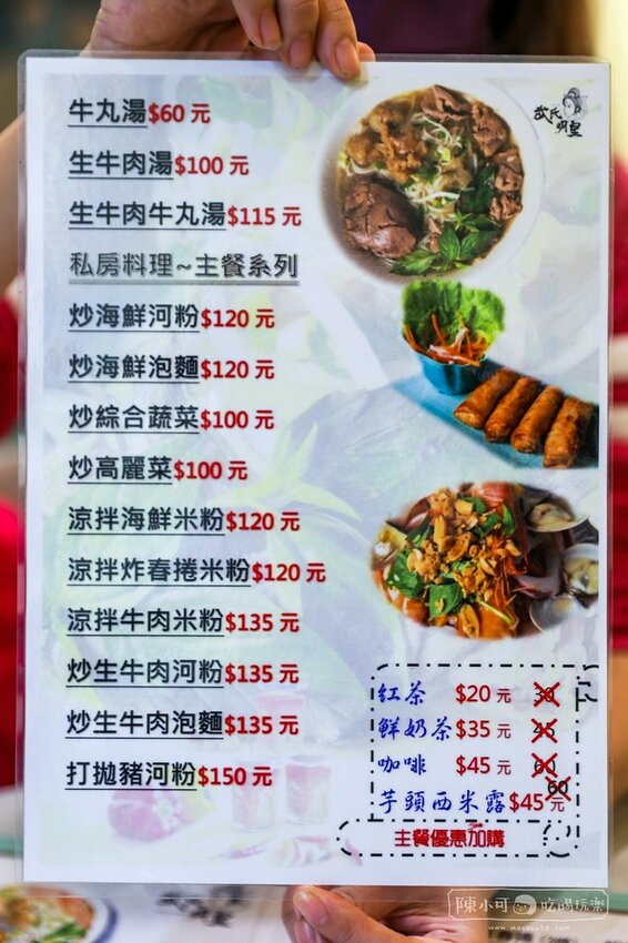 品項簡單的菜單,畫星號是推薦,有招牌牛肉河粉、打拋豬、綜合春、涼拌海鮮和芋頭西米露等餐點,漂亮的手繪來自於老闆本人,我還以為請專業的人士畫的呢!