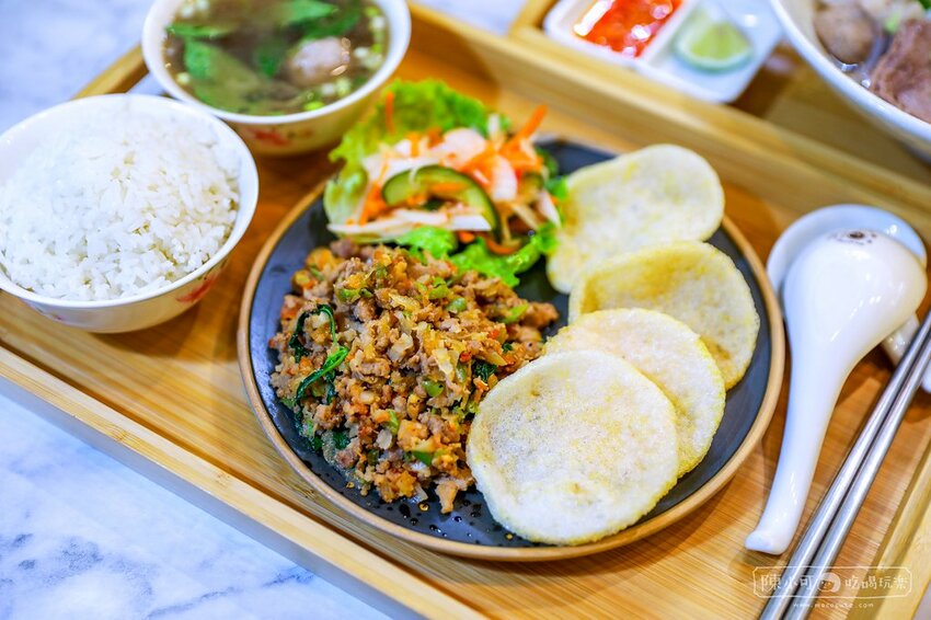 老闆娘本身就是越南人,這拿手的菜真的必點,用了我很愛的四季豆加上番茄、番茄和絞肉爆炒,打拋豬鹹香下飯,相當開胃,香米飯也是煮的非常好吃,旁邊還附有一碗牛肉丸湯。