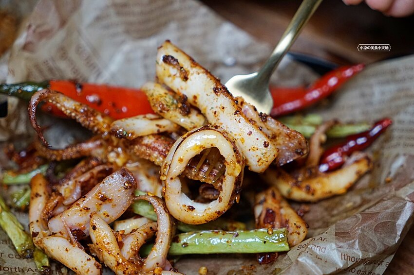 採用店家特製的椒麻粉拌炒,不只是香氣足、那又辣又麻的風味更是讓中卷吃起來彈牙又Q嫩,不管是搭上生啤酒、飲料、冰沙通通都很讚!!