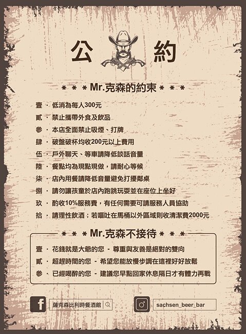 薩克森 美式餐酒館 Sachsen Beer Bar菜單,菜色以美式跟西式餐點為主,所以菜單內會有義大利麵、燉飯、排餐、手工墨西哥捲餅、下酒菜、風味雞翅、手工披薩、炸物、調酒以及精釀啤酒等,這邊有低消$300,禁止攜帶外食、飲品等,寵物可入店內唷!!