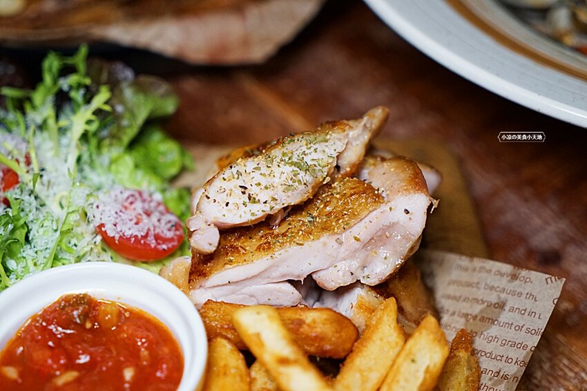 乾煎雞腿排佐莎莎醬,除了現煎雞腿排以外,還有生菜、脆薯、手工墨西哥餅皮以及特製莎莎醬