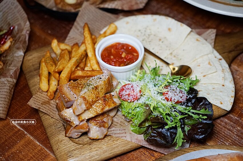 不用懷疑! 店家建議的吃法就是以墨西哥餅皮將雞腿排、生菜、薯條以及莎莎醬通通都包起來吃,很神奇吧! 但這樣的吃法讓人一吃就愛上,因為口感變得很豐富,滋味更加有層次,不空虛的吃法加上莎莎醬的清爽提味,更是涮嘴不已呢