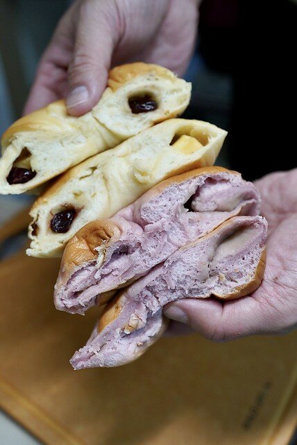 紫薯芋頭以手工紫心甘藷泥製作麵包體,搭配大甲芋頭楓糖餡,兩種口味一次滿足是甜蜜點Q胖貝果熱銷款之一比例搭配不甜膩,蟬聯甜蜜點熱銷排行榜