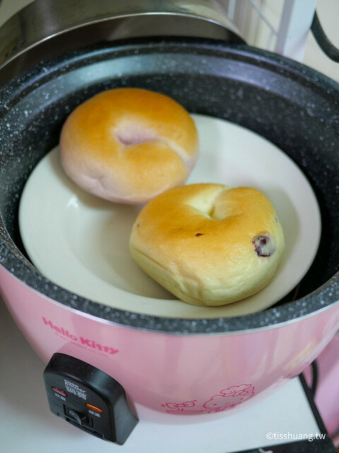 電鍋加熱: 放置於可加熱之容器,再放入電鍋隔水加熱蒸5分鐘,按下電源待其跳起即可食用,蒸出來的貝果會像麵包口感,較為濕潤,Tiss個人比較喜歡這種口感
