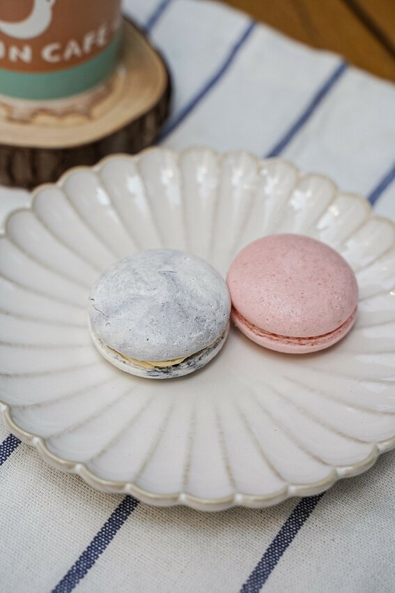 ▲ 大理石巧酥馬卡龍,使用天然竹炭粉特製,搭配無糖的香草鮮奶油 吃起來微微酥脆,不會太甜膩!