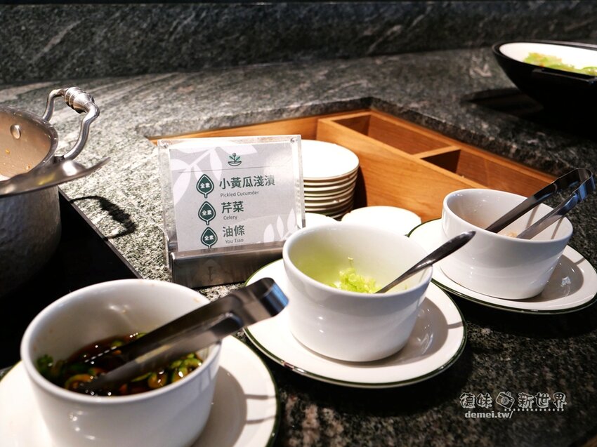 一旁備有小黃瓜淺漬、芹菜、油條等可配粥。