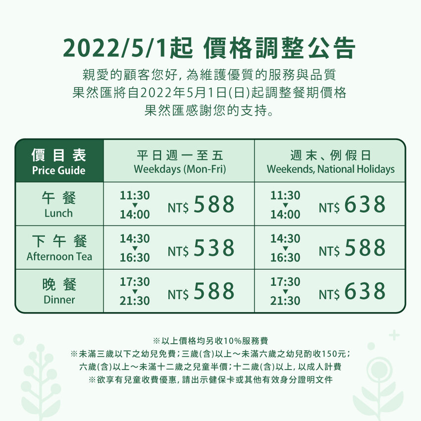 所有果然匯分店價格也即將在5/1日全面調整,詳情請見果然匯官網公告。