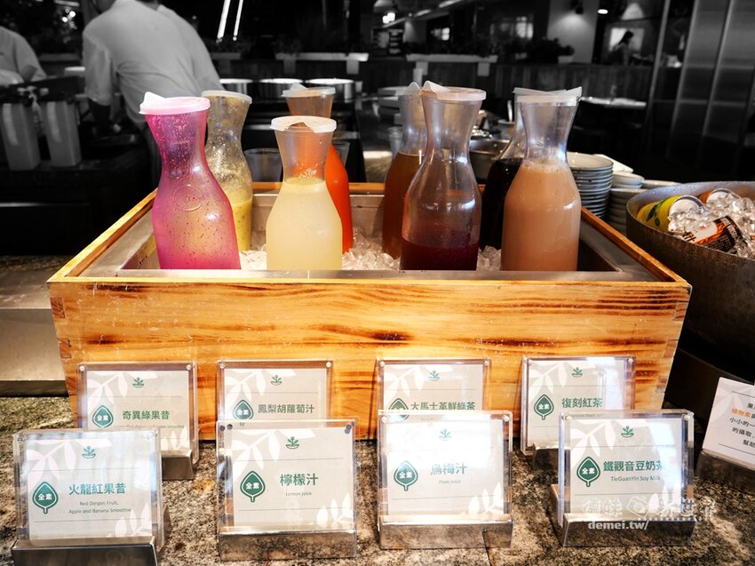 烏梅汁,大馬士革鮮綠茶、檸檬汁、鳳梨胡蘿蔔汁、火龍紅果昔、奇異綠果昔。
