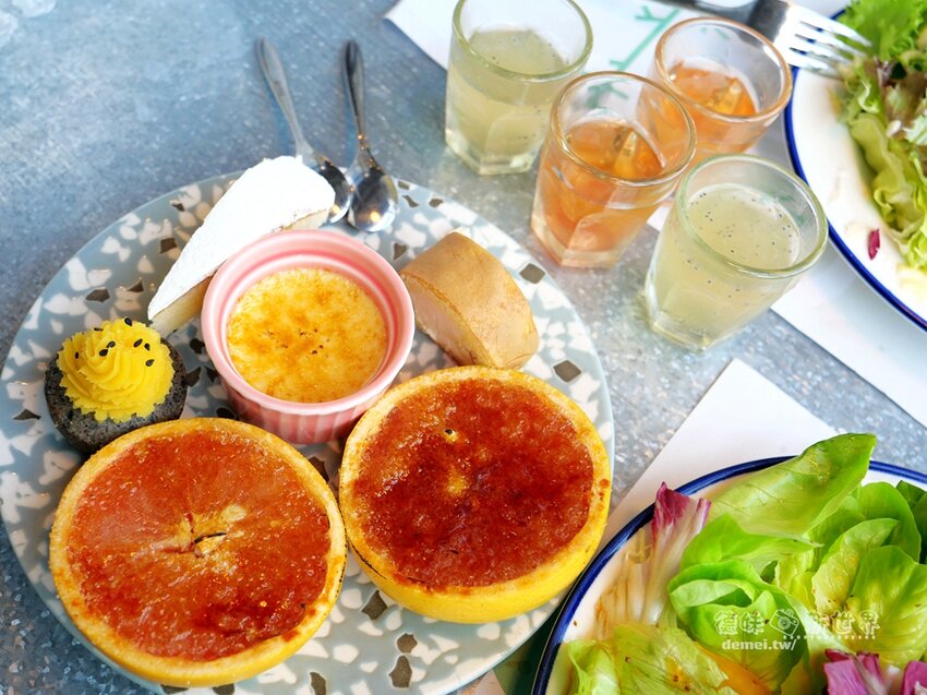 現燒薄脆焦糖搭配酸甜葡萄柚,果肉厚汁液多,一次半顆去油解膩很滿足。