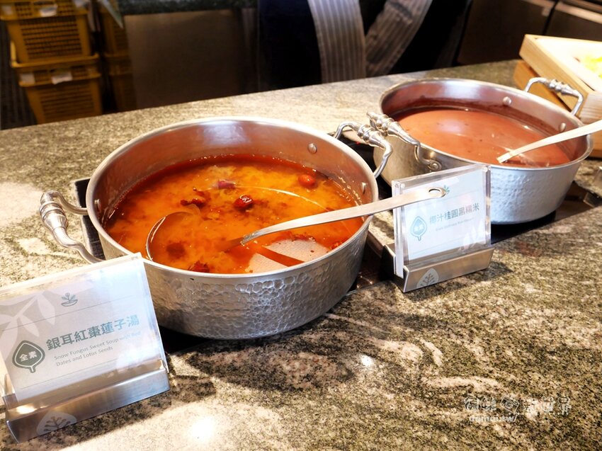 兩款甜湯,椰汁桂圓黑糯米、銀耳紅棗蓮子湯。