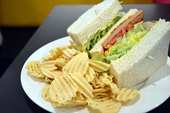 「德國羅浮火腿厚切土司」(160元)-- 土司裡夾著生菜沙拉及最重要的火腿片,一旁還附有洋芋片。