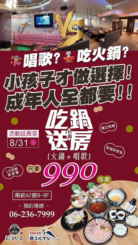 貳鍋三火鍋&賓士ktv南紡店 點貳鍋三火鍋就送賓士ktv南紡店兩小時歡唱,邊吃鍋邊唱歌$990起,多款風格包廂、主廚熬煮湯頭,包廂內有空氣清淨機。