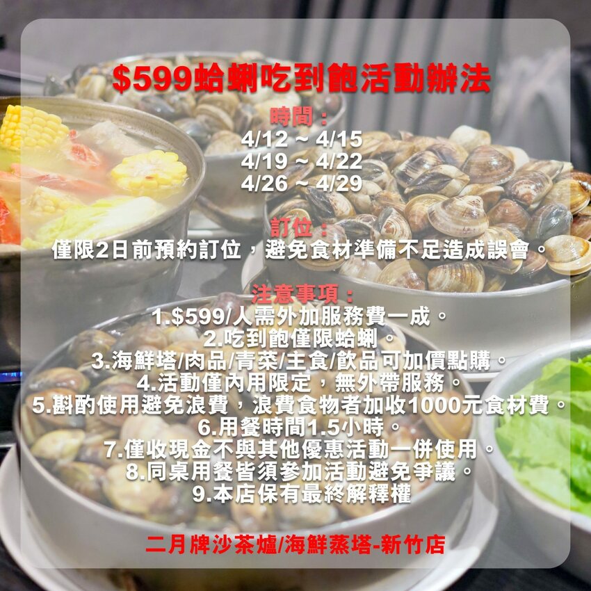 無低消限制,$599/人就可以參加 蛤仔吃到飽 活動!