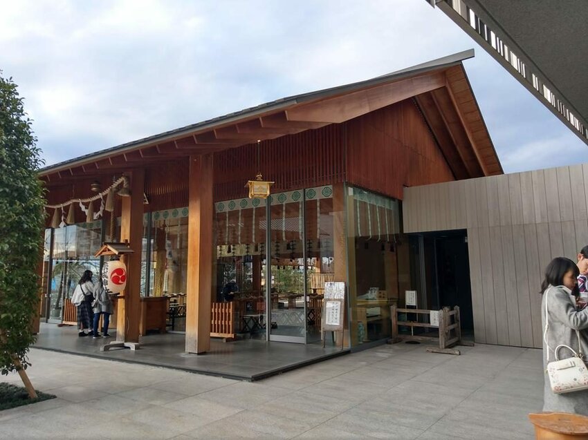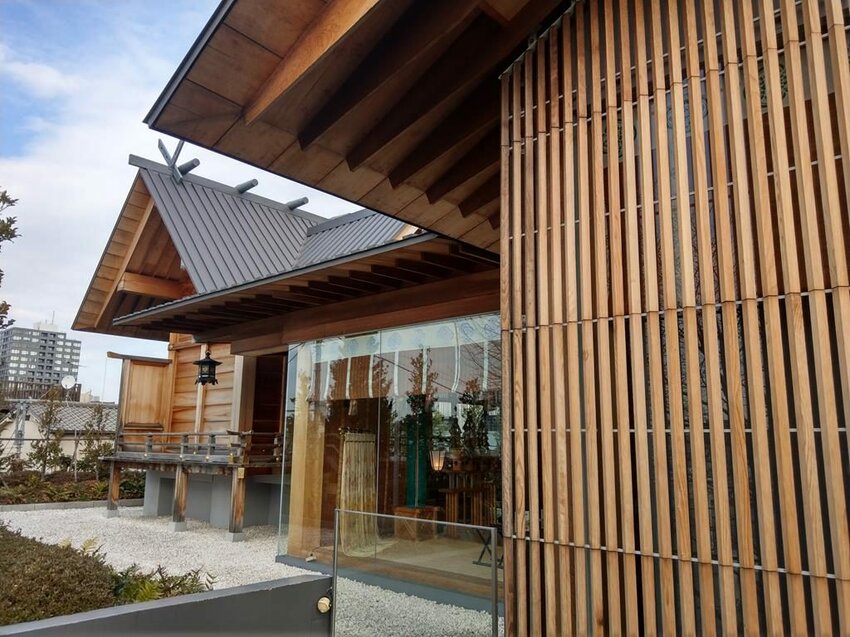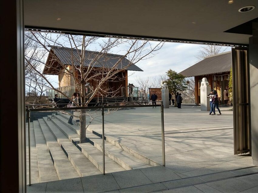 大師果然不愧是大師,用了暖色系的木頭材質來凸顯神社的存在,而整個神社呈現出潔白、時尚、清新的意象,一旁的建築物則是以冷色系和不搶眼的線條來降低存在感,不但讓位於一樓的『社務所』能夠繼續服務,也讓樓上的住戶不會破壞神社的整個氛圍。搭配各種玻璃和採光,大師隈研吾重新打造出一個符合現代人美觀的新神社。