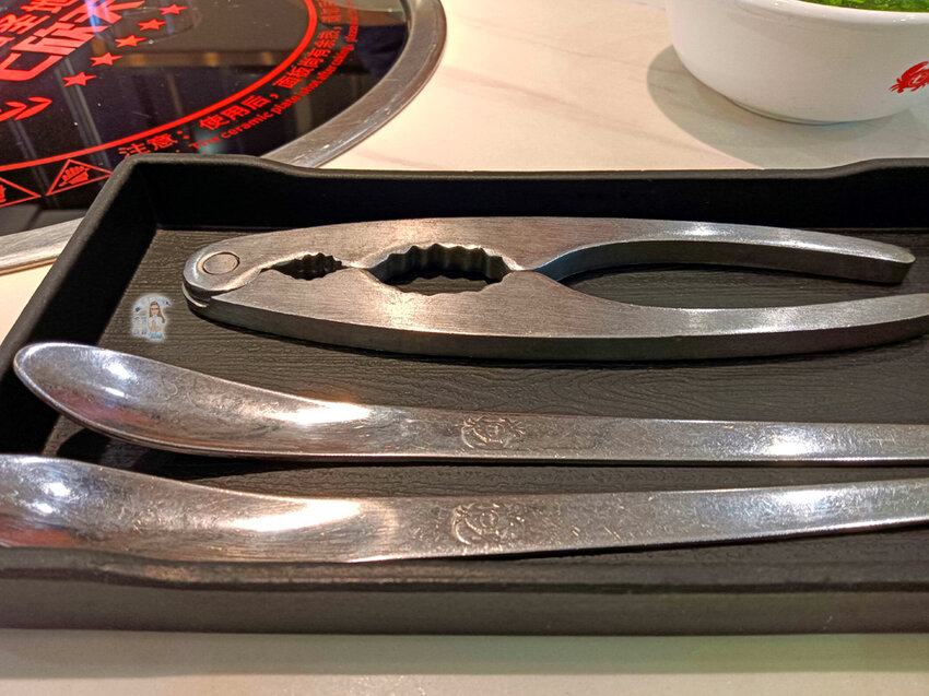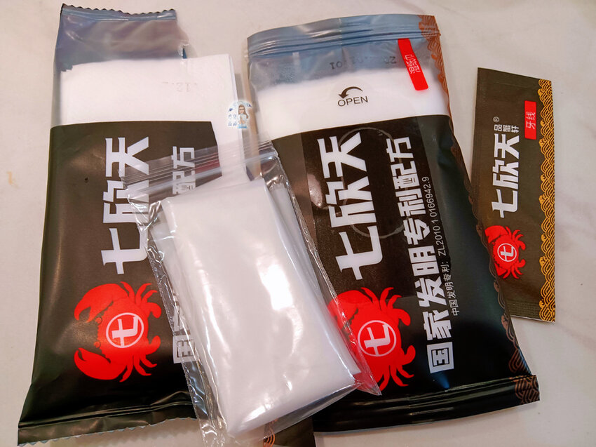 餐具也很齊全,有吃螃蟹專用的鐵鉗也有客人一次性的餐具包,裡面不僅有手套、牙籤,還有乾的和濕的紙巾,應有盡有。