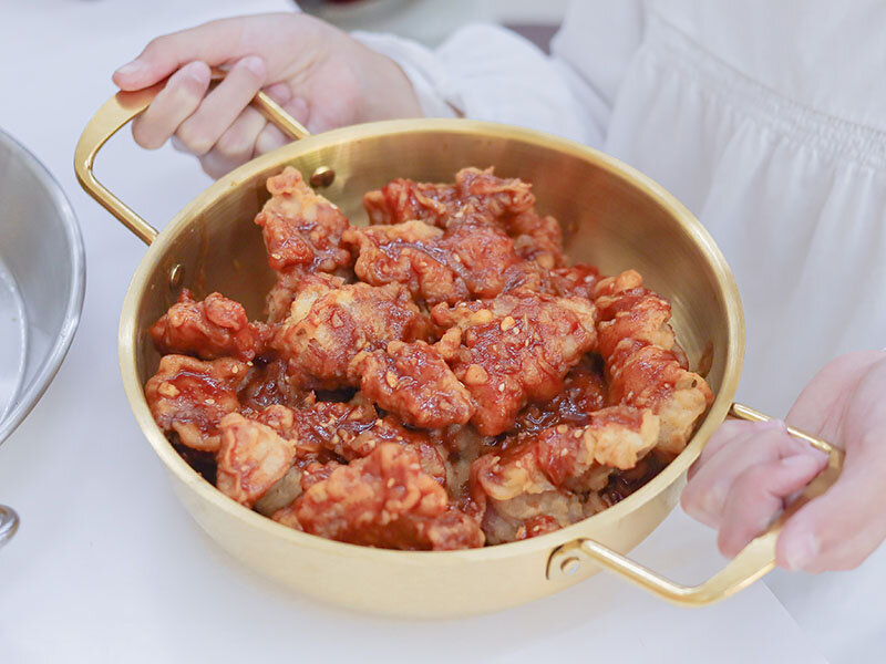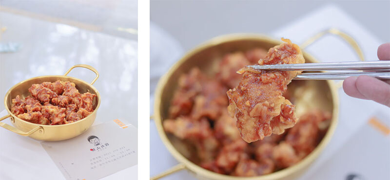 炸雞是本體,韓式特醬就是靈魂,去骨的無骨雞肉塊盛放在綽號小金(不是叫我)的淺鍋子中,刷上紅澄澄的醬汁,還以為又是辣口的一道韓式料理,卻被入口的檸檬酸氣給破防,領頭的酸度稍緩特調醬的辣度,使得辣度渲染更有層次,到了喉嚨之間才感受辣度噴發,一酸一辣的拉扯就是辣卻不膩的好滋味。酥脆的麵衣咬著吭吭作響,還有淡淡的白芝麻香。