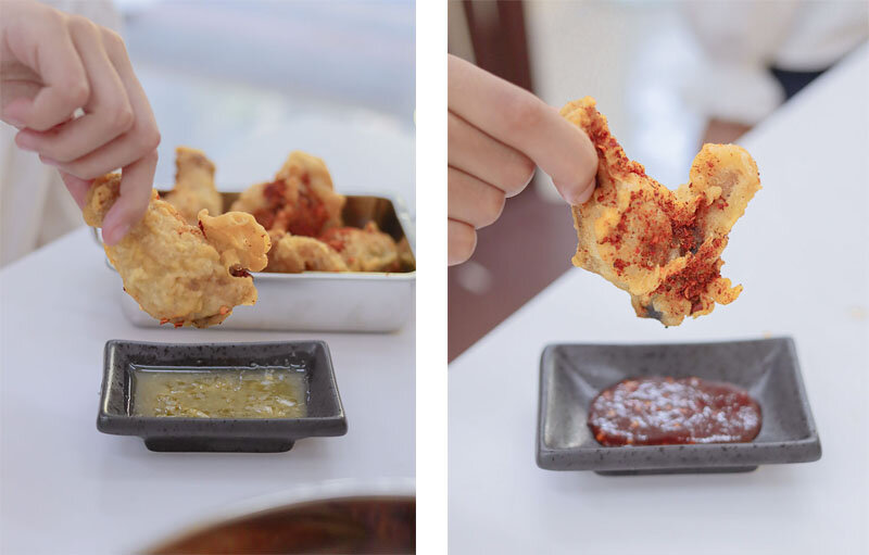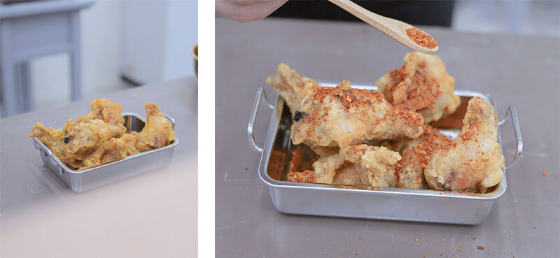 盛上具有韓風的銀色小盤子前,還有靜置瀝油這道手續,再均勻的撒上香麻粉;招牌小炸雞一份有六塊,相對市區一隻雞翅就要$15元,這個價格滿划算的;金黃酥脆的外皮但不像一般的炸雞那麼的深黃色,炸衣薄脆裹住鮮嫩雞肉,香滑雞汁滴滴入口;香麻粉是大人基本口味,吃過一次就會喜歡,不過小草、小花吃就會覺得稍微辣了些。