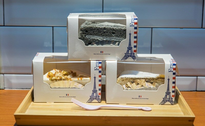 應該是切片蛋糕都是預先放在盒子裡,增加客人外帶的速度,內用也是有盒子,只是感覺有一點浪費紙盒,好處是吃不完直接裝回去帶走xd