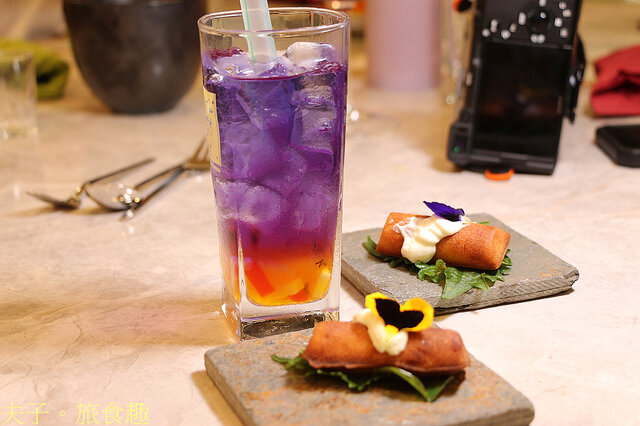 飲品「虎爺風情畫」,以蘋果醋、檸檬汁、百香果醬及蝶豆花水調製,多層顏色象徵虎爺溫泉的黃金琥珀泉、溫泉花以及花蓮湛藍的天空。