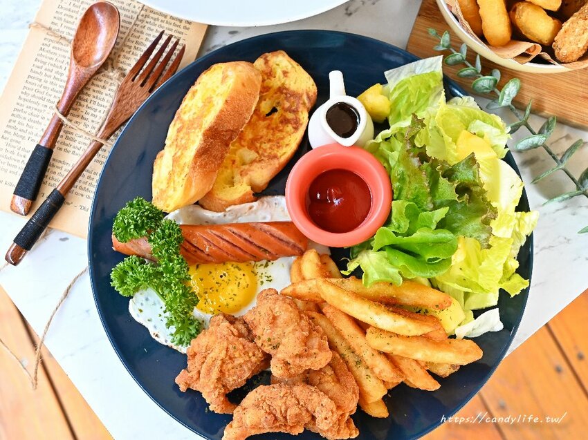 柒柒手作料理最新推出的早午餐柒柒特製總匯,原價259元,現在嘗鮮價只要199元,裡頭超澎派,大圓盤整個裝滿滿,裡頭包含太陽蛋、德式香腸、特製炸雞、沙拉及法國麵包