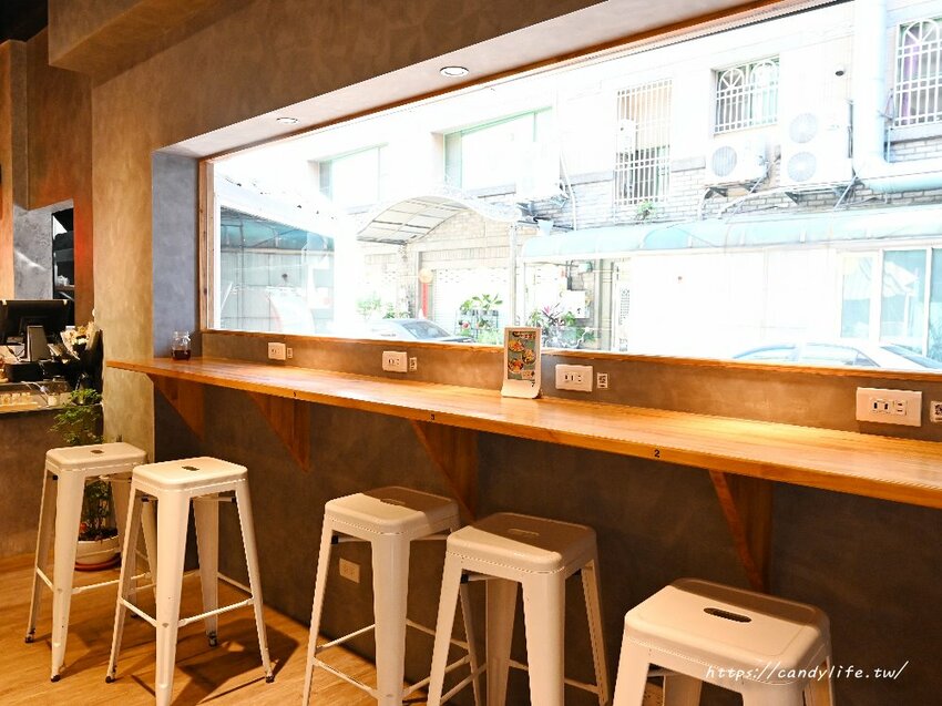 柒柒手作料理裝潢走文青工業風路線,復古水泥牆、木質系地板搭配大理石紋桌子,看起來非常有質感,空間寬敞舒適,除了一般座位區,還有靠窗的高腳座椅區,很適合一個人前來享用早午餐,店家很貼心,還附上了插座,提供給客人免費使用