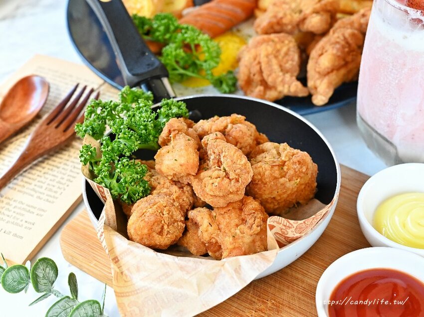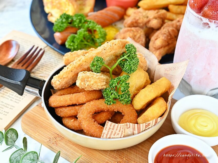 柒柒手作料理的綜合拼盤可以任選三樣炸物,糖糖選了雞柳條、雞塊及洋蔥圈,都是現點現炸,外皮酥脆不油膩,雞柳條吃起來帶有微微的檸檬香氣,雞塊跟洋蔥圈也好吃,小朋友的最愛