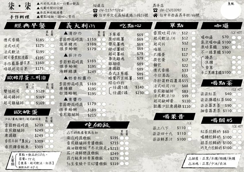 柒柒手作料理除了人氣早午餐,還有歐姆蛋三明治、歐姆蛋系列、義大利麵、燉飯、小點及飲品,品項多樣化,內用無酌收服務費,每人低消是一份餐點或一杯飲料