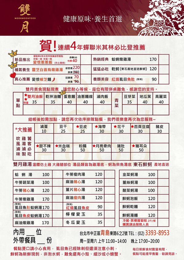「雙月食品社」是台北知名的養生雞湯餐廳,已經連續4年榮獲米其林必比登推介,