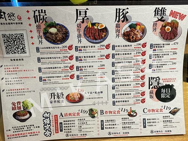 菜單部分是一張兩面,第一面NT$199起跳的各種丼飯與加價購的定食組合,可以根據自己想要的加價NT$109或NT$119選擇定食搭配,一碗丼飯或咖哩飯只能加購一組定食,這個加購的價格是不算入低消計算的,我們是選擇了定食A—清爽定食NT$109,有沙拉、飲料、甜點的套餐。