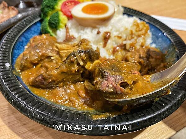 他們的咖哩挖起來分量跟飯差不多,口味上就其實有點吃不出咖哩味,就覺得有點香料味、鹹鹹甜甜的,口感感覺有點像乾咖哩,醬汁收的很偏乾稠,都可以乾吃的感覺,感覺是煮得很認真但我吃不太出主題,不過我要誇獎一下他們的米飯,煮的很好吃!我是很愛吃很飽滿米飯的人,他們的米飯很飽滿、很Q,吃起來甜甜的,是我超愛吃的那一種米飯!上面還有一些蔬菜跟唐心蛋,還滿均衡的。