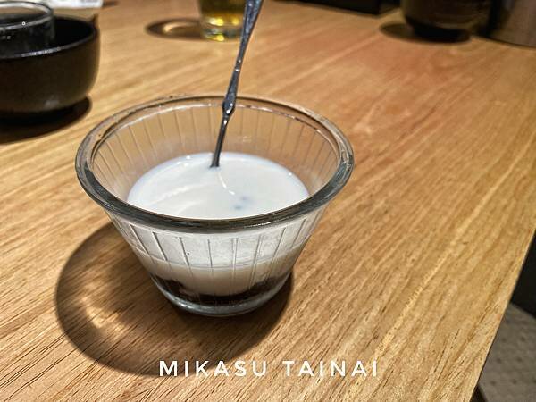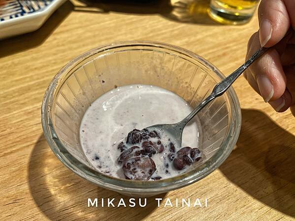 最後上的甜點為了方便大家觀看我先拉到前面一起說,甜點當天是有提供黑糖涼糕跟紅豆紫米,我是選了紅豆紫米,不意外就是紅豆加上紫米燉熟之後加入牛奶,吃之前要攪拌均勻,不然就會是牛奶配紅豆紫米了~他們沒有煮的很甜,小小一杯不是很大,飯後吃一個涼涼的甜湯還滿開心的。