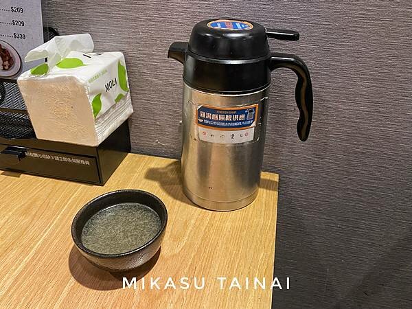 餐桌旁會放置一個保溫壺,裡面放置的是店家每日熬煮的雞骨高湯,喝起來調味不是說很重、帶有淡淡的雞肉香氣,等餐的時候喝一碗暖暖胃還不錯,大概跟我們去碳佐麻里可以喝到的差不多,