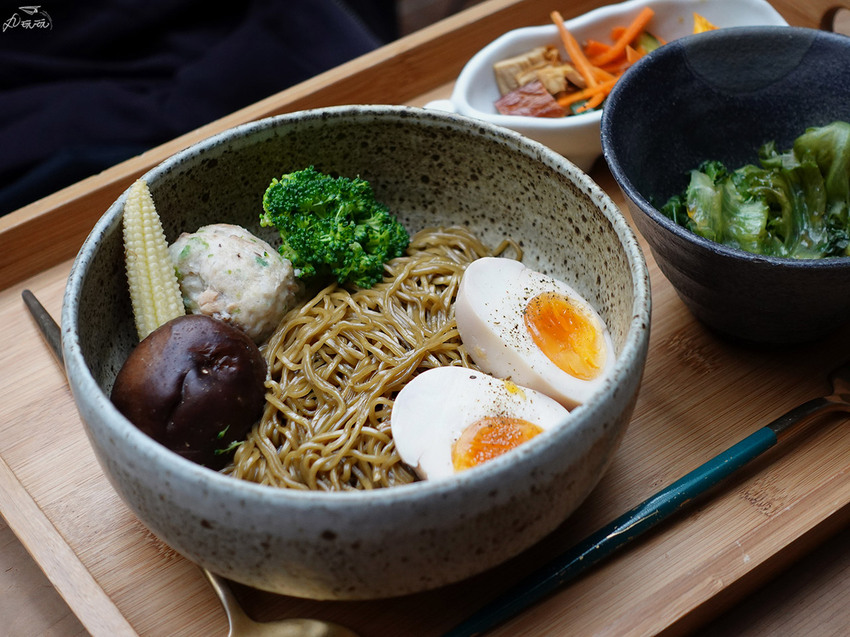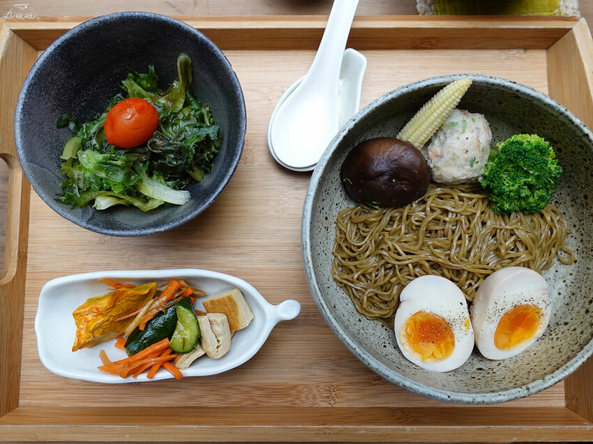 主食的部分,已將醬料均勻拌入麵中,一旁還有配菜跟溏心蛋。醬料均勻沾附在麵體上,麵體細帶著微微的辣與麻,辣度不至於太高;溏心蛋柔嫩的蛋白,中心帶膏狀的蛋黃,整體沒有過重的調味,透出微微的甜與蛋香。配菜的部分有時蔬和素香菇海藻丸子,時蔬的部分口味清淡原味呈現,相對素丸子加入其他食材調味後扎實有嚼勁,蠻好吃的。