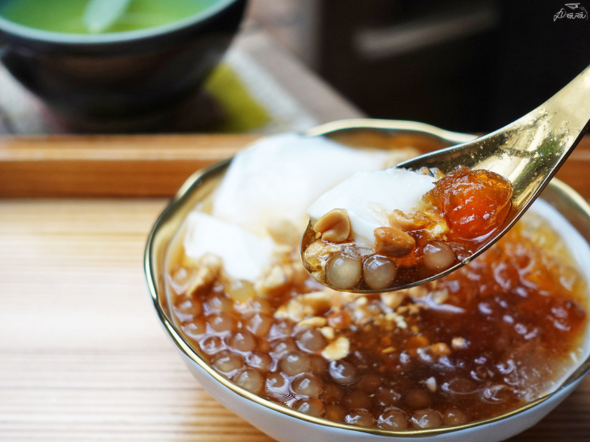 豆花在嘴裡四溢的豆香,以柔嫩的質地和滑順的口感在嘴裡瞬間化開,真的就像在吃絹豆腐,搭配淡甜的黑糖糖水,是好吃的豆花呢!此外,酌料的表現也不俗,有白玉珍珠恰到好處的Q度和桃膠的軟凍感,然而最讓我驚豔的花生酥。糖和花生拌炒後讓花生酥帶著甜度,充滿花生香脆口不會太硬,豐富了口感上的層次,太加分了!