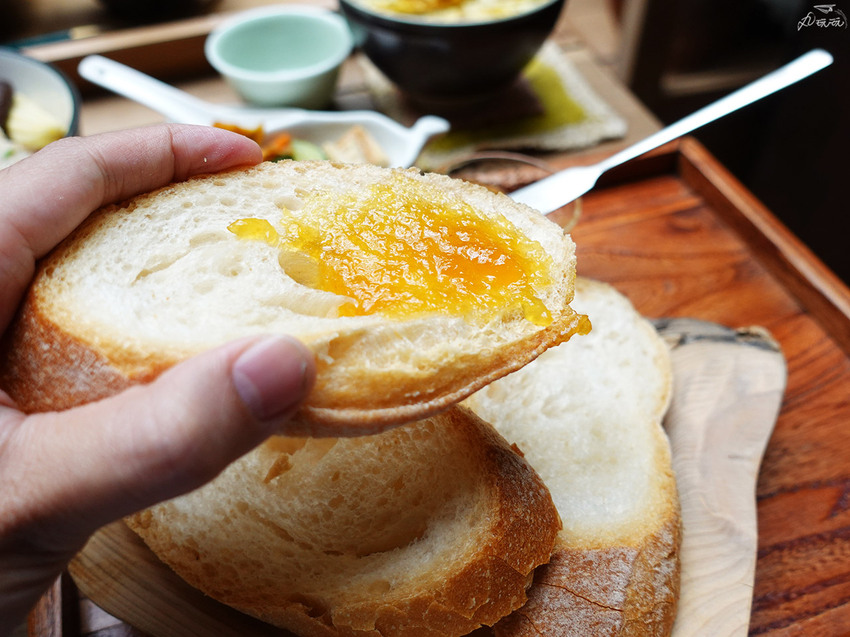 上面是套餐的部分,麵包控的我因為宅宅選擇搭配米飯,我只好加點手工麵包滿足我的口腹之慾。手工麵包搭配來自台東自製的金鑽鳳梨果醬。鳳梨果醬的鳳梨味香甜濃郁,幾乎沒有酸感,不太喜歡鳳梨本人的我,卻意外喜歡這款自製果醬。唯獨麵包吃起來偏乾,比較不是我喜歡的口感。