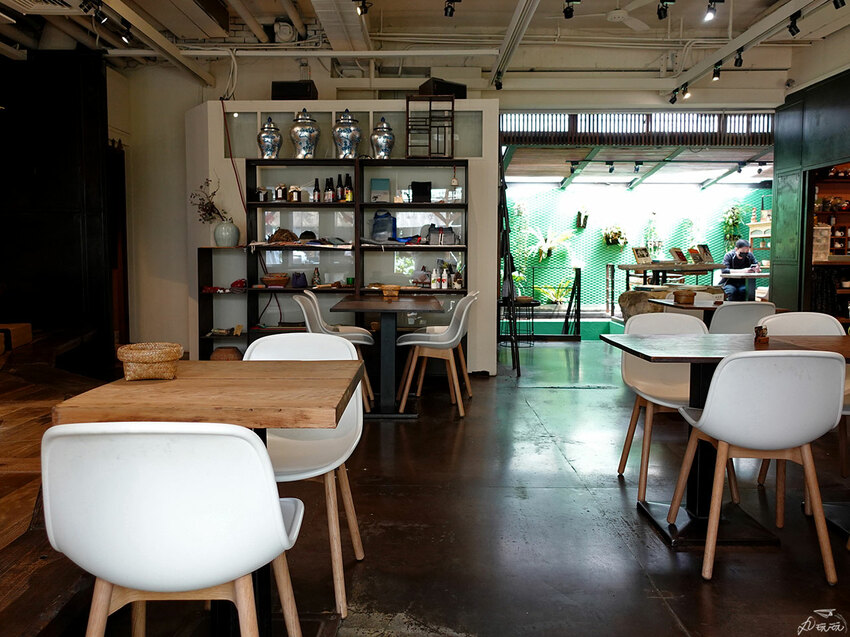 進入餐廳內部,原來裡頭還有不少座位,更特別的是用餐區整體質樸古風呈現,卻又營造出不盡相同的空間感,令人眼睛為之一亮。中央的用餐區,多以四人桌為主;最內側的區域則以兩人桌為主,此區採用自然光與植栽牆,光線特別好呢!