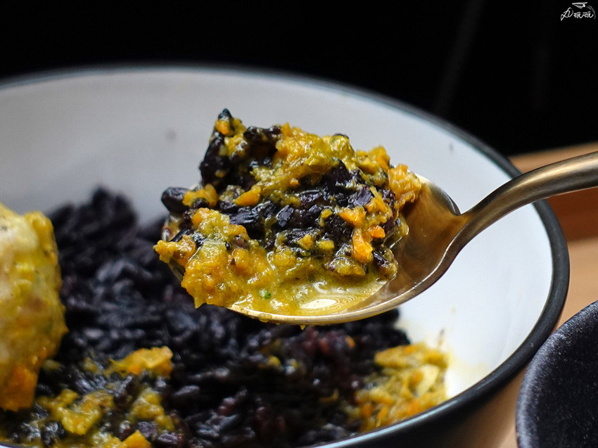 男友選擇檸檬香菜綠咖哩搭配黑纖米飯。聚落山海的咖哩均採用台東大巴六九藥用植物園區野菜為基底,使得綠咖哩有如草本的清純爽辣風味。粒粒分明的黑纖米飯自帶獨特米香Q度也夠,搭配微辣的咖哩醬,辛香味十足口感層次豐富。不過宅宅卻始終覺得少了個味,我並不覺得,推測大概他就是肉控的關係吧!
