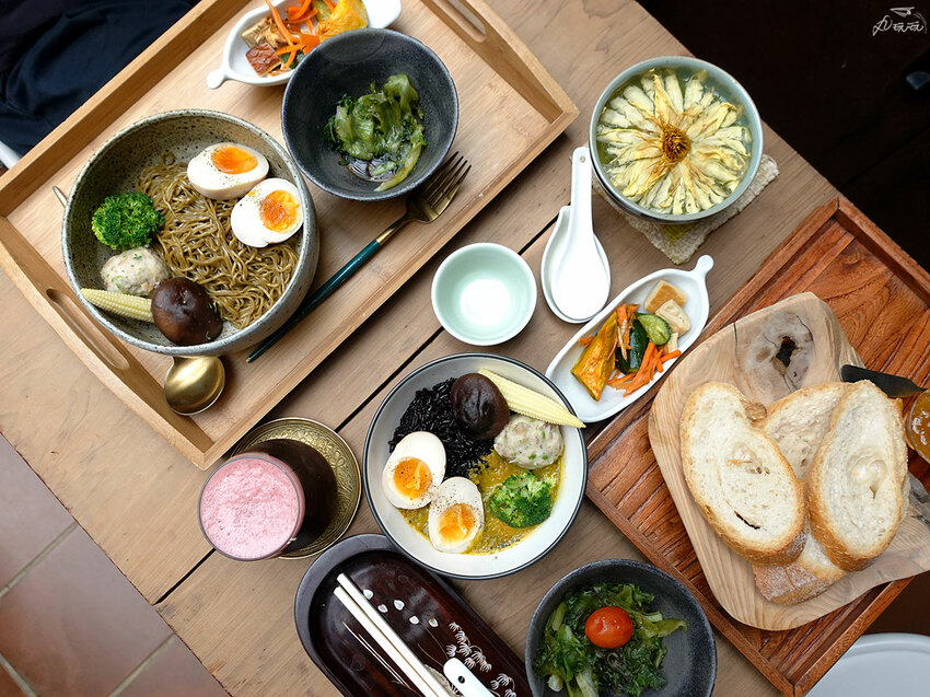 茶食套餐的內容除了主食,皆包含季節時蔬、野菜、自家小菜、溏心蛋、素丸子茶點及茶飲
