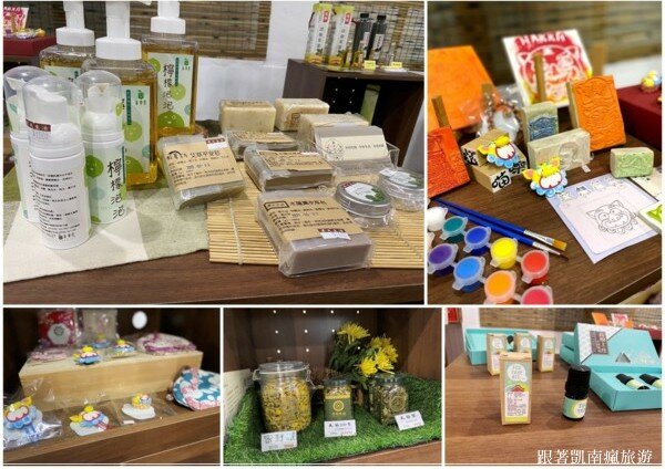 規劃出在地農產銷售有茶樹精油、鳳梨醬、印加果油、天菊葉,還有很棒的文創小物
