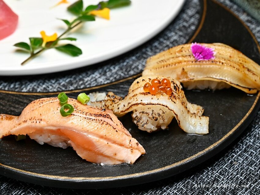 握壽司的部分包含炙燒鮭魚肚握壽司、炙燒鰭邊肉及炙燒星鰻握壽司,糖糖最愛吃炙燒握壽司,經過炙燒後,多了迷人的炙燒香氣,鮭魚肉質軟嫩,含豐富油脂,鰭邊肉是比目魚鰭邊肉,油花比較豐富,喜歡油脂較豐富的朋友會很愛這款