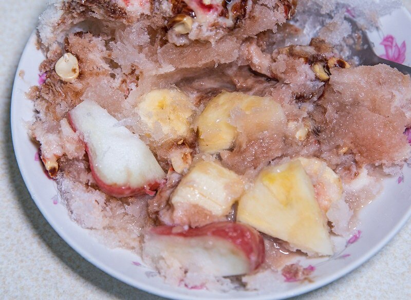 挫冰底下就是水果冰的風貌,除了上述的香蕉、西瓜、鳳梨外還有連霧,老闆說除了前三樣外,隨著季節會再多加一兩樣,也有個人會指定放自己喜歡的水果,沒有特別非要加什麼不可。這時,我才知道原來不是附了兩根湯匙,其中一把是叉子(一直藏在冰中沒看清楚)。