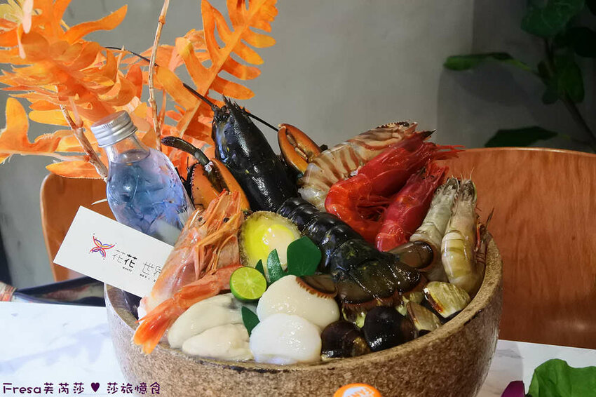 台南火鍋國賓影城附近美食「花花世界鍋物」充滿南洋風情舒適氛圍.高檔奢華龍蝦海鮮盤太吸睛.麻辣孜然鴛鴦鍋風味超獨特