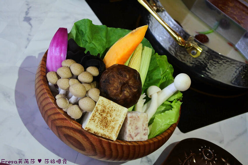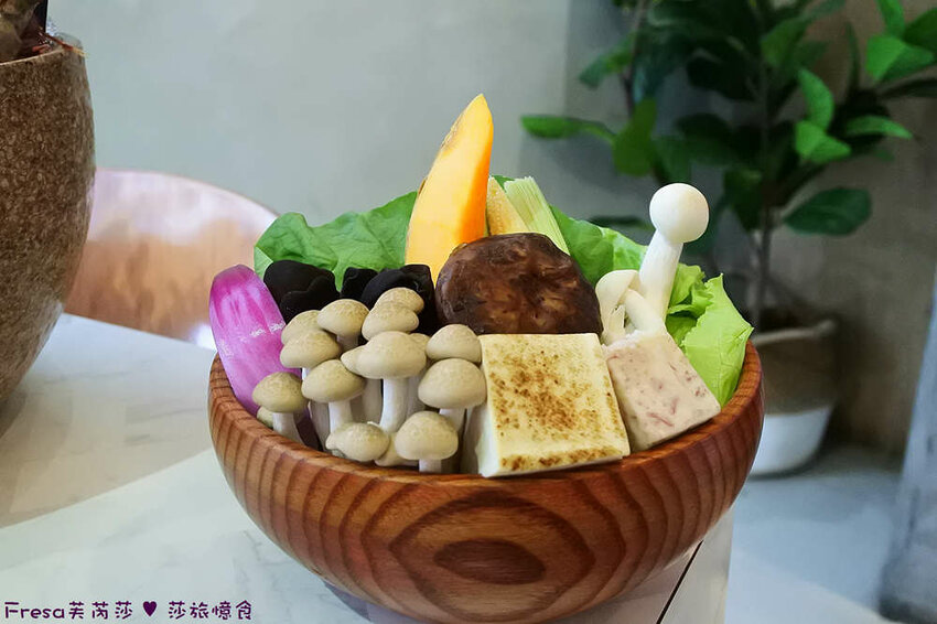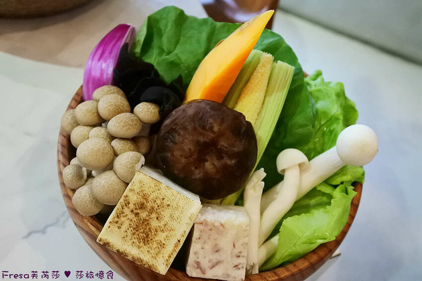 菜盤包含各樣的蔬菜,菇類、南瓜、芋頭、蔬菜、洋蔥、黑木耳、玉米筍、凍豆腐等等蔬菜.