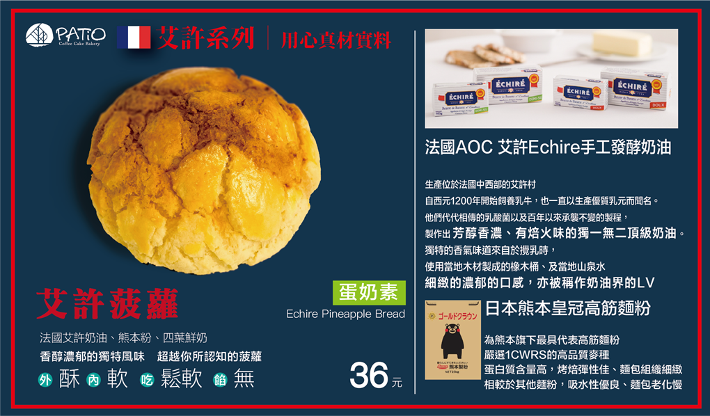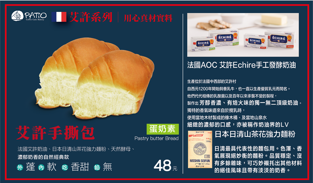 最近老闆非常的闊氣,麵包食材再升級,使用的奶油是比安佳奶油還要高單價的法國AOC艾許Echire手工發酵奶油及日本麵粉去製作細緻的麵包蛋糕。