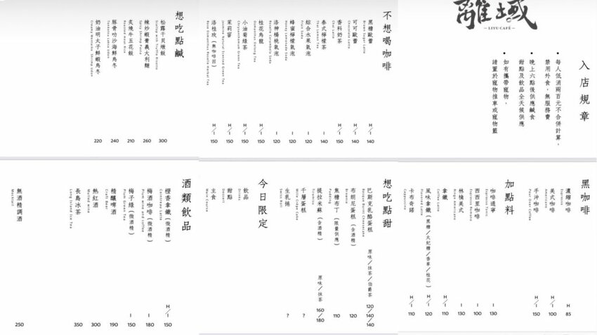 ▼【離域Café】以咖啡及甜點為主打,其中以手工製作的招牌甜點最有人氣,每到晚上6點後有供應鹹食,包含燉飯和義大利麵等品項,也有供應酒類飲品,每人低消為200元,不能夠合併使用。