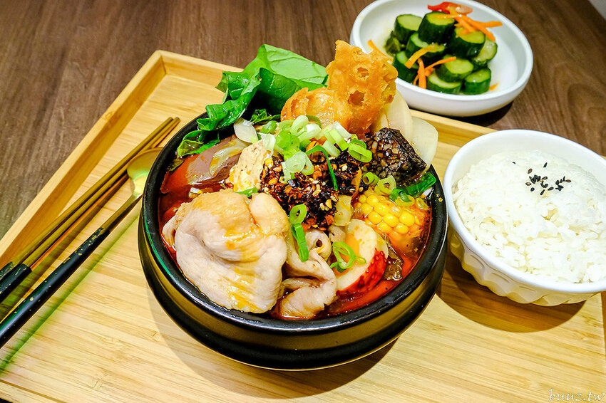 接下來則是鍋物,分麻辣鍋跟胡椒白湯鍋底兩系列,再搭配麻辣魯肉飯、香蔥油拌飯、小菜、湯品及冷泡茶。(點餐後由店家上菜,提倡餐後自助餐盤回收)