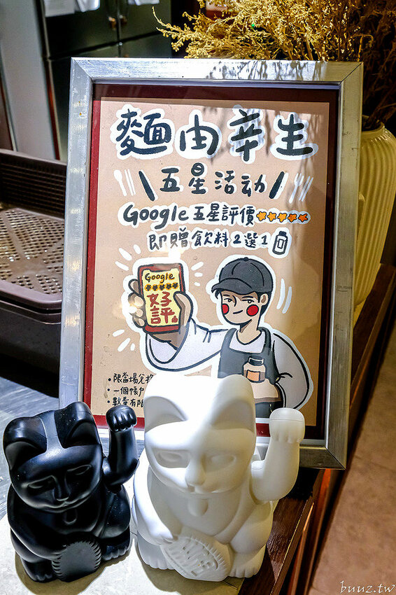 現在只要到Google地圖上找到「麵由辛生」留言評價五顆星,立即贈送一瓶飲料哦~