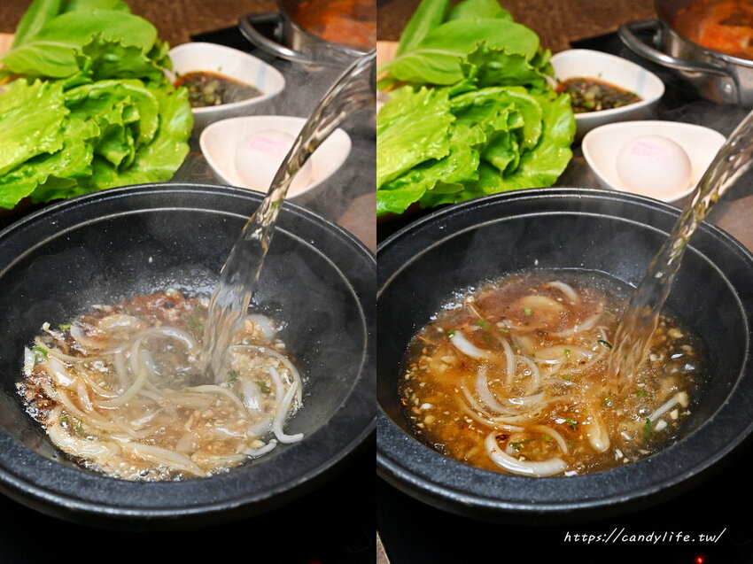 論石間鍋物的人氣湯底,採桌邊服務,上桌時先加入洋蔥、青蔥及蒜頭下去拌炒,接著淋上特製醬汁,再加入蔬菜高湯,撲鼻而來的香氣令人著迷不已,湯頭清甜好喝,尾韻還帶著迷人的蒜香味