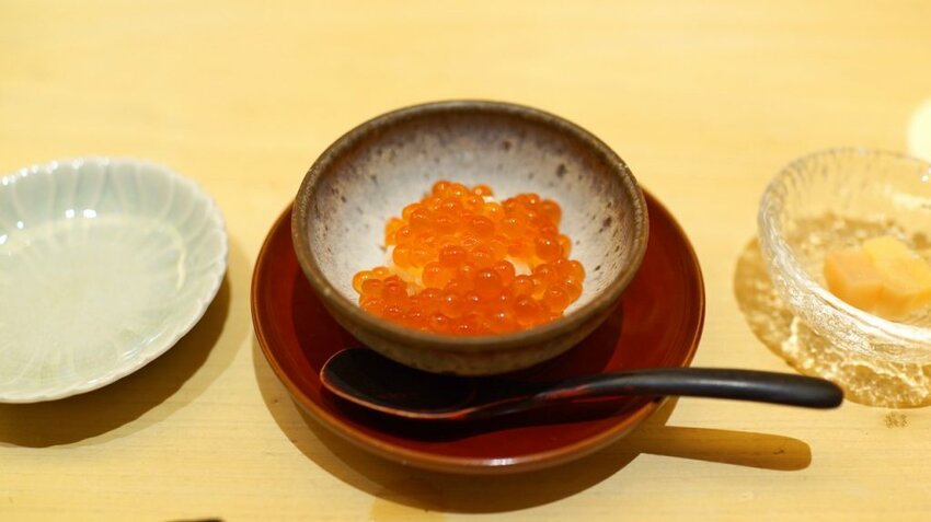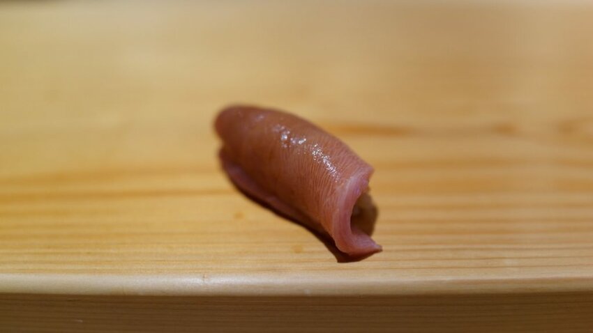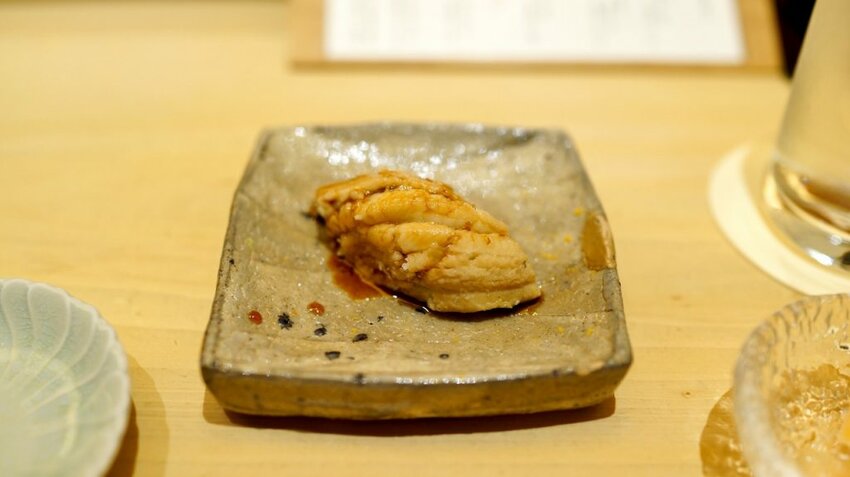接著口味轉變為白肉魚 鰆魚、花枝、貝肉,之後是鰹魚與鮭魚卵軍艦,再收以馬糞海膽,最後以穴子與鮪魚海苔卷結束這回合。